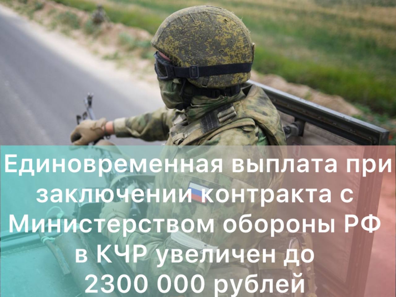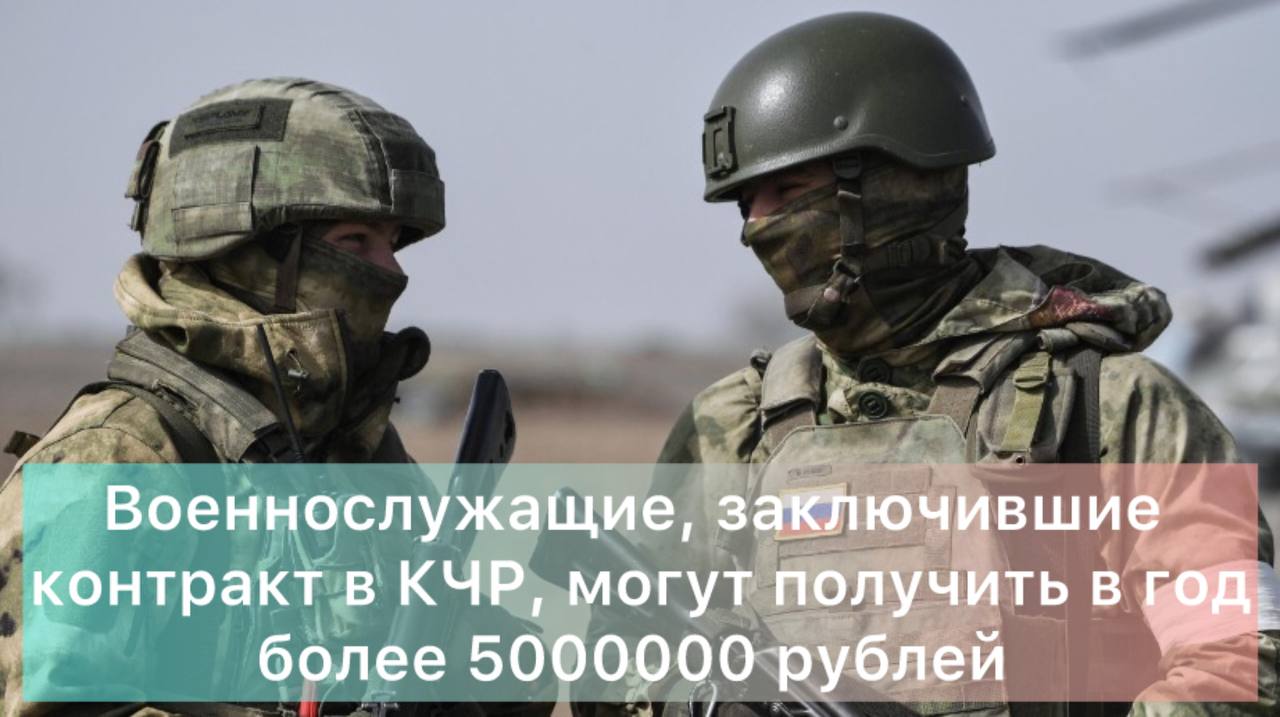 Напоминаем: размер единовременной региональной выплаты при заключении контракта с Министерством обороны РФ в Карачаево-Черкесии увеличен до 1 900 000 рублей, с учётом федеральной выплаты размер единовременной выплаты может составить до 2 300 000 руб. Военнослужащие, заключившие контракт в КЧР, могут получить в год более