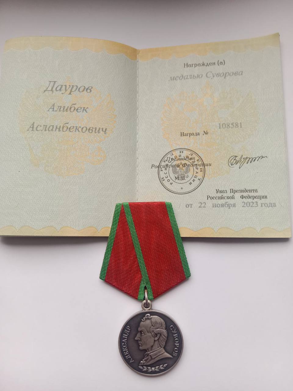 За личное мужество и отвагу Алибек был награжден Медалью Суворова – одной из самых почетных военных наград. Медалью министерства обороны РФ - участника Специальной военной операции. Его профессионализм и ответственное отношение к службе также были отмечены грамотой командиром взвода.