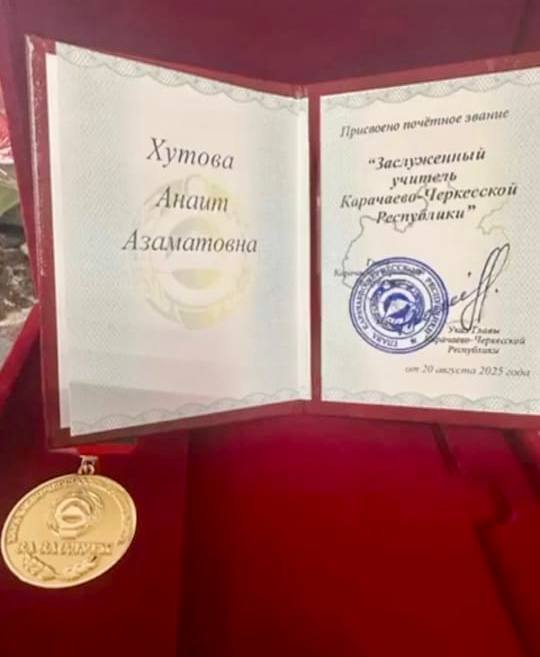 с профессиональным праздником и вручил заслуженные награды — почётные звания «Заслуженный учитель Карачаево-Черкесии» и «Заслуженный работник народного образования КЧР». Среди награжденных была педагог МБОУ «СОШ А. Али-Бердуковский имени Джамбекова С. Г.» Хутова Анаит Азаматовна.